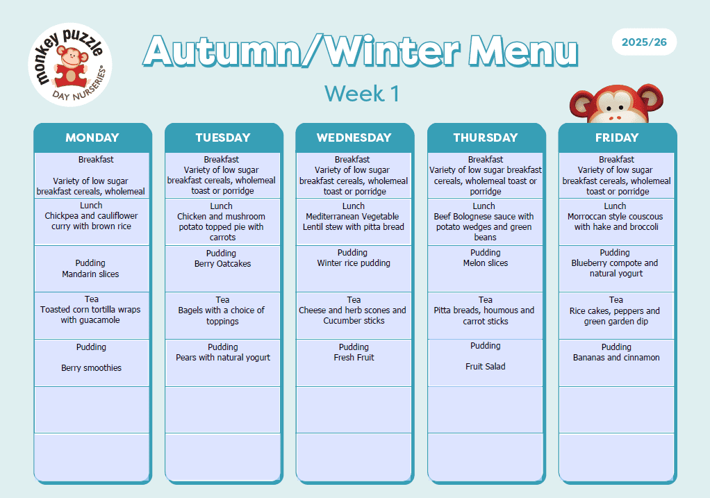 At Monkey Puzzle, we believe that healthy eating in childhood lays the foundation for a lifetime of good habits. Our approach to early childhood nutrition ensures every child enjoys balanced, freshly prepared meals that meet their childhood nutritional needs. Each dish is designed to support growth, learning, and wellbeing, with mealtimes that are a happy, sociable part of their day.